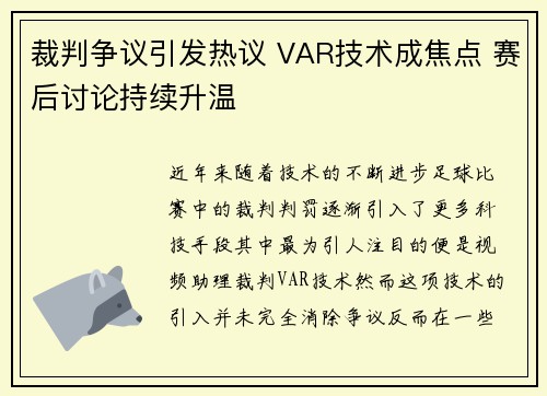 近年来,随着技术的不断进步,足球比赛中的裁判判罚逐渐引入了更多科技手段,其中最为引人注目的便是视频助理裁判(VAR)技术。然而,这项技术的引入并未完全消除争议,反而在一些关键时刻引发了更多的讨论。裁判...