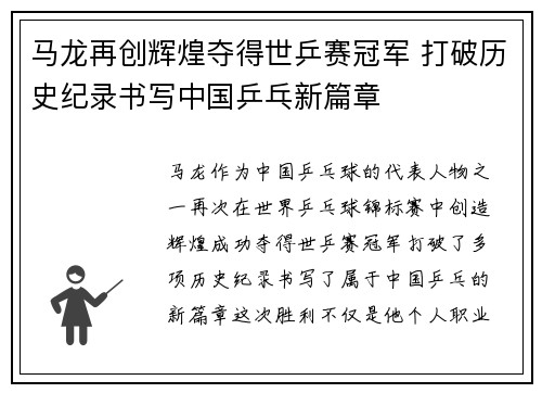 马龙,作为中国乒乓球的代表人物之一,再次在世界乒乓球锦标赛中创造辉煌,成功夺得世乒赛冠军,打破了多项历史纪录,书写了属于中国乒乓的新篇章。这次胜利不仅是他个人职业生涯的巅峰,也是中国乒乓球历史的新一页...