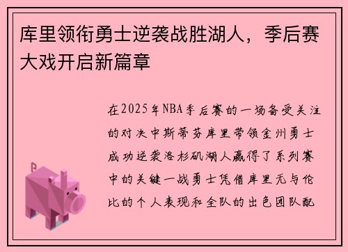 在2025年NBA季后赛的一场备受关注的对决中,斯蒂芬·库里带领金州勇士成功逆袭洛杉矶湖人,赢得了系列赛中的关键一战。勇士凭借库里无与伦比的个人表现和全队的出色团队配合,在这场比赛中战胜了对手,扭转了...