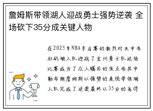 在2025年NBA季后赛的激烈对决中,洛杉矶湖人队迎战了金州勇士队,这场比赛成为了众人瞩目的焦点。而其中,勒布朗·詹姆斯以强势的表现带领湖人队完成了逆袭,最终以35分的高得分成为全场最关键的球员。本文...