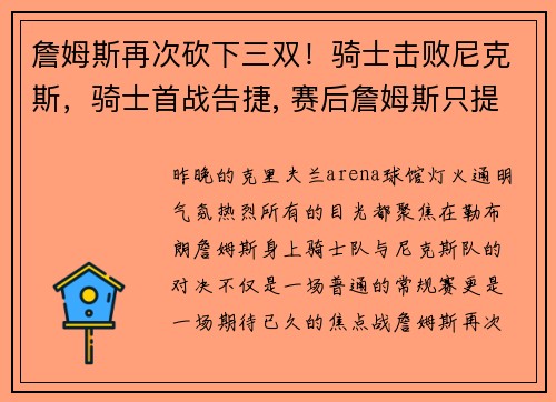 昨晚的克里夫兰arena球馆灯火通明,气氛热烈,所有的目光都聚焦在勒布朗·詹姆斯身上。骑士队与尼克斯队的对决不仅是一场普通的常规赛,更是一场期待已久的焦点战。詹姆斯再次用他的全能表现证明了自己依然是联...