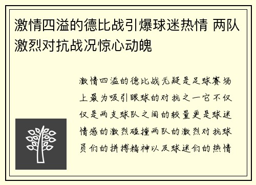 激情四溢的德比战无疑是足球赛场上最为吸引眼球的对抗之一,它不仅仅是两支球队之间的较量,更是球迷情感的激烈碰撞。两队的激烈对抗,球员们的拼搏精神,以及球迷们的热情支持,都使得这场比赛成为了一个足球文化的...