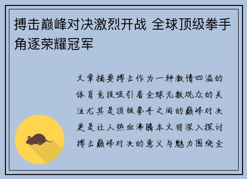 文章摘要:搏击作为一种激情四溢的体育竞技,吸引着全球无数观众的关注,尤其是顶级拳手之间的巅峰对决,更是让人热血沸腾。本文将深入探讨搏击巅峰对决的意义与魅力,围绕全球顶级拳手如何角逐荣耀冠军这一主题,分...
