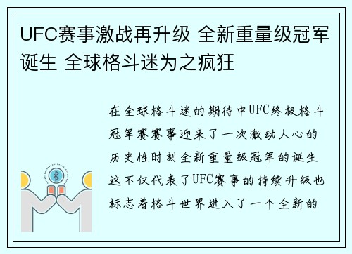 在全球格斗迷的期待中,UFC(终极格斗冠军赛)赛事迎来了一次激动人心的历史性时刻:全新重量级冠军的诞生。这不仅代表了UFC赛事的持续升级,也标志着格斗世界进入了一个全新的时代。作为全球最大的综合格斗组...