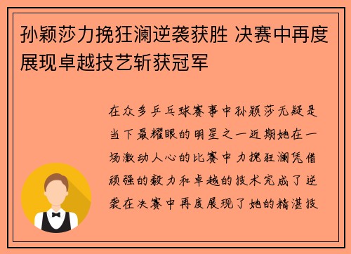 在众多乒乓球赛事中,孙颖莎无疑是当下最耀眼的明星之一。近期,她在一场激动人心的比赛中力挽狂澜,凭借顽强的毅力和卓越的技术完成了逆袭,在决赛中再度展现了她的精湛技艺,最终赢得了冠军。这场比赛不仅是她个人...