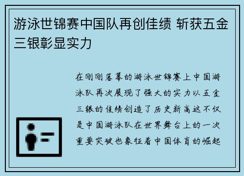 在刚刚落幕的游泳世锦赛上,中国游泳队再次展现了强大的实力,以五金三银的佳绩创造了历史新高。这不仅是中国游泳队在世界舞台上的一次重要突破,也象征着中国体育的崛起。本文将围绕中国游泳队在此次世锦赛中的卓越...