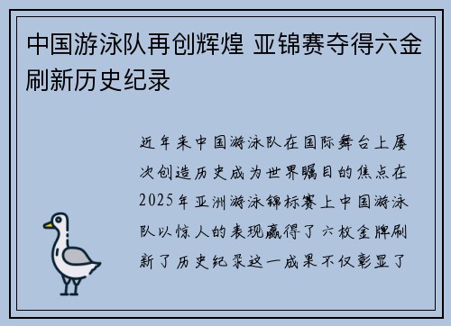 近年来,中国游泳队在国际舞台上屡次创造历史,成为世界瞩目的焦点。在2025年亚洲游泳锦标赛上,中国游泳队以惊人的表现赢得了六枚金牌,刷新了历史纪录。这一成果不仅彰显了中国游泳队的实力,也为中国体育界增...