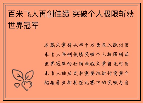 本篇文章将从四个方面深入探讨百米飞人再创佳绩,突破个人极限,斩获世界冠军的壮丽旅程。文章首先对百米飞人的历史和重要性进行简要介绍,接着分析其在比赛中的突破与自我挑战,最后总结其如何通过不懈的努力和高强...