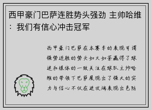 西甲豪门巴萨在本赛季的表现可谓强势,连胜的势头如火如荼,赢得了球迷和媒体的一致关注。在球队主帅哈维的带领下,巴萨展现出了强大的实力与信心,不仅在进攻端表现出色,防守也日渐稳固。哈维表示,球队的目标明确...