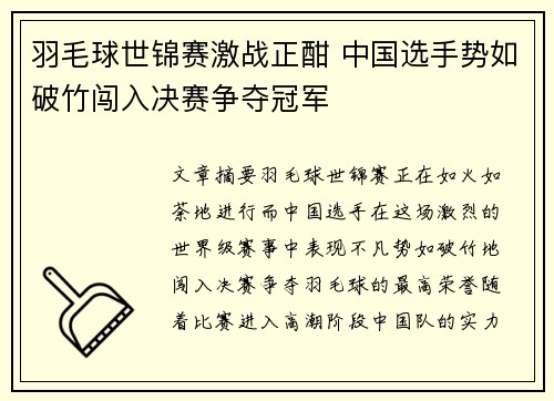 文章摘要:羽毛球世锦赛正在如火如荼地进行,而中国选手在这场激烈的世界级赛事中表现不凡,势如破竹地闯入决赛,争夺羽毛球的最高荣誉。随着比赛进入高潮阶段,中国队的实力得到了广泛的认可。选手们在各个项目中的...
