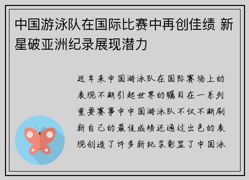 近年来,中国游泳队在国际赛场上的表现不断引起世界的瞩目。在一系列重要赛事中,中国游泳队不仅不断刷新自己的最佳成绩,还通过出色的表现创造了许多新纪录,彰显了中国泳坛的强大实力和潜力。特别是新兴的游泳新星...
