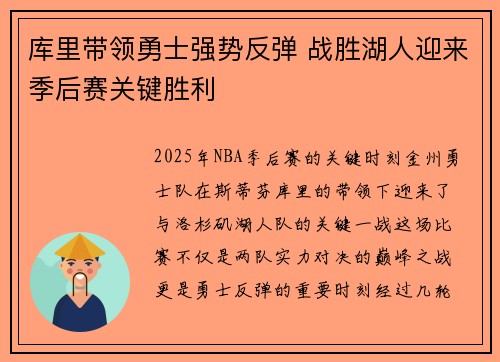 2025年NBA季后赛的关键时刻,金州勇士队在斯蒂芬·库里的带领下,迎来了与洛杉矶湖人队的关键一战。这场比赛不仅是两队实力对决的巅峰之战,更是勇士反弹的重要时刻。经过几轮跌宕起伏的战斗,勇士在这场比赛...