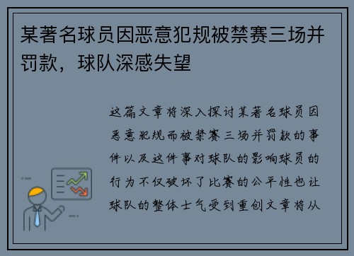 这篇文章将深入探讨某著名球员因恶意犯规而被禁赛三场并罚款的事件,以及这件事对球队的影响。球员的行为不仅破坏了比赛的公平性,也让球队的整体士气受到重创。文章将从四个方面详细分析:首先,恶意犯规的性质及其...