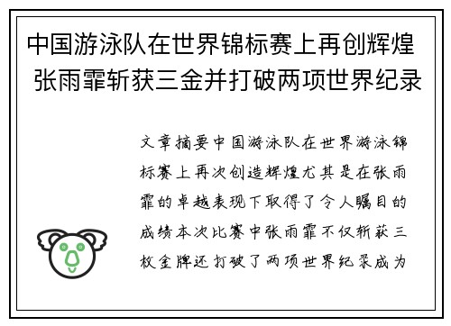 文章摘要:中国游泳队在世界游泳锦标赛上再次创造辉煌,尤其是在张雨霏的卓越表现下,取得了令人瞩目的成绩。本次比赛中,张雨霏不仅斩获三枚金牌,还打破了两项世界纪录,成为全球泳坛焦点。她的出色表现不仅展现了...