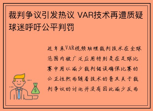 近年来,VAR(视频助理裁判)技术在全球范围内被广泛应用,特别是在足球比赛中,用以减少裁判错误,确保比赛的公正性。然而,随着技术的普及,关于裁判争议的讨论并没有因此减少,反而由于某些判罚争议变得更加激...