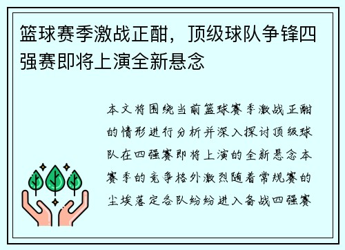 本文将围绕当前篮球赛季激战正酣的情形进行分析,并深入探讨顶级球队在四强赛即将上演的全新悬念。本赛季的竞争格外激烈,随着常规赛的尘埃落定,各队纷纷进入备战四强赛阶段,悬念丛生。从强队的表现、球员的个人状...