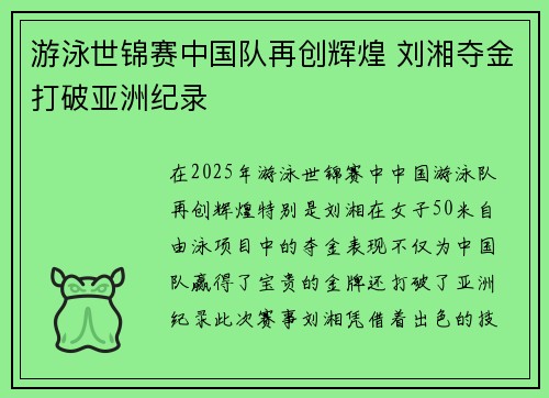 在2025年游泳世锦赛中,中国游泳队再创辉煌,特别是刘湘在女子50米自由泳项目中的夺金表现,不仅为中国队赢得了宝贵的金牌,还打破了亚洲纪录。此次赛事,刘湘凭借着出色的技术、顽强的毅力以及坚韧不拔的精神...
