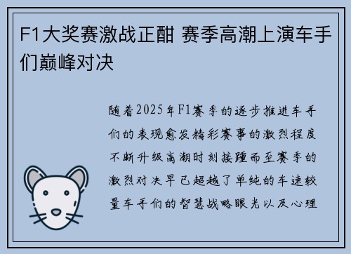 随着2025年F1赛季的逐步推进,车手们的表现愈发精彩,赛事的激烈程度不断升级,高潮时刻接踵而至。赛季的激烈对决早已超越了单纯的车速较量,车手们的智慧、战略眼光以及心理素质成为了制胜的关键。当前赛季,...