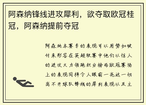 阿森纳本赛季的表现可以用“势如破竹”来形容。在英超联赛中,他们以惊人的进攻火力领跑积分榜,而欧冠赛场上的表现同样令人眼前一亮。这一切离不开球队锋线的犀利表现,以及主教练阿尔特塔对战术的精准把控。 阿森...