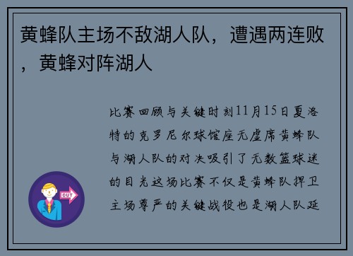 比赛回顾与关键时刻 11月15日,夏洛特的克罗尼尔球馆座无虚席,黄蜂队与湖人队的对决吸引了无数篮球迷的目光。这场比赛不仅是黄蜂队捍卫主场尊严的关键战役,也是湖人队延续连胜的重要机会。比赛一开始,黄蜂队...