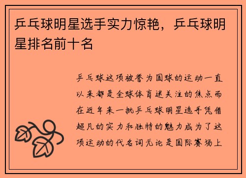乒乓球,这项被誉为“国球”的运动,一直以来都是全球体育迷关注的焦点。而在近年来,一批乒乓球明星选手凭借超凡的实力和独特的魅力,成为了这项运动的代名词。无论是国际赛场上的巅峰对决,还是地方赛事中的精彩表...