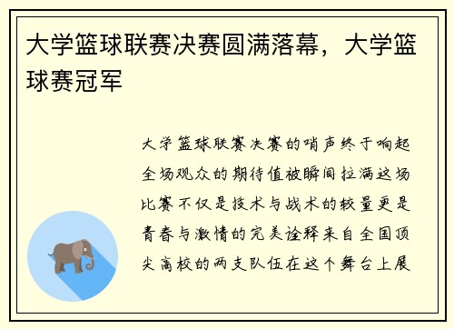 大学篮球联赛决赛的哨声终于响起,全场观众的期待值被瞬间拉满。这场比赛不仅是技术与战术的较量,更是青春与激情的完美诠释。来自全国顶尖高校的两支队伍,在这个舞台上展开了一场巅峰对决。他们的每一次运球、每一...
