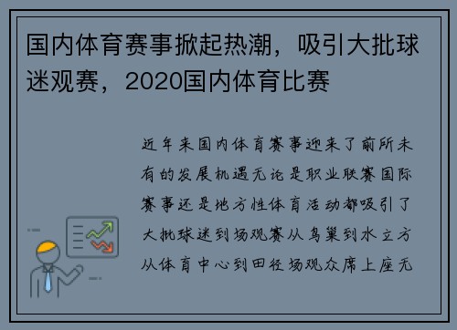 近年来,国内体育赛事迎来了前所未有的发展机遇。无论是职业联赛、国际赛事,还是地方性体育活动,都吸引了大批球迷到场观赛。从鸟巢到水立方,从体育中心到田径场,观众席上座无虚席,体育赛事的热度持续攀升。 这...