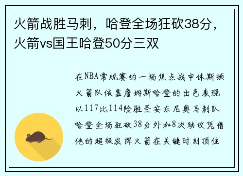 在NBA常规赛的一场焦点战中,休斯顿火箭队依靠詹姆斯·哈登的出色表现,以117比114险胜圣安东尼奥马刺队。哈登全场狂砍38分,外加8次助攻,凭借他的超级发挥,火箭在关键时刻顶住了马刺的反扑,最终取得...