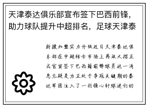 新援加盟,实力升级! 近日,天津泰达俱乐部在中超转会市场上再放大招,正式官宣签下巴西籍前锋球员。这一消息无疑是为正处于争冠关键期的泰达军团注入了一剂强心针。球迷们的热情也被彻底点燃,社交媒体上瞬间掀起...
