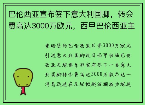 重磅签约!巴伦西亚斥资3000万欧元引进意大利国脚 近日,西甲劲旅巴伦西亚足球俱乐部宣布签下一名意大利国脚,转会费高达3000万欧元。这一消息迅速在足坛掀起波澜,成为球迷和媒体关注的焦点。巴伦西亚俱乐...