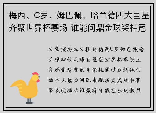 文章摘要:本文探讨梅西、C罗、姆巴佩、哈兰德四位足球巨星在世界杯赛场上角逐金球奖的可能性。通过分析他们的个人能力、团队表现、历史成就和赛事表现,揭示谁最有可能在如此激烈的竞争中脱颖而出。1、个人能力比...
