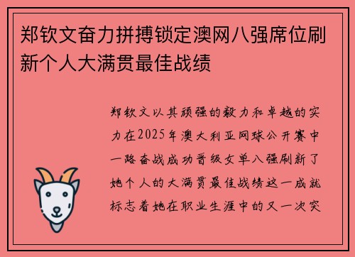 郑钦文以其顽强的毅力和卓越的实力,在2025年澳大利亚网球公开赛中一路奋战,成功晋级女单八强,刷新了她个人的大满贯最佳战绩。这一成就标志着她在职业生涯中的又一次突破,同时也为中国网球注入了新的希望。郑...