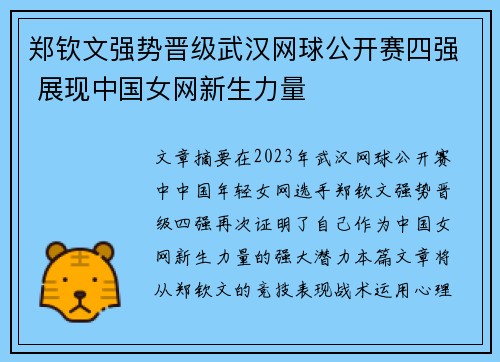 文章摘要:在2023年武汉网球公开赛中,中国年轻女网选手郑钦文强势晋级四强,再次证明了自己作为中国女网新生力量的强大潜力。本篇文章将从郑钦文的竞技表现、战术运用、心理素质以及对中国女网的影响四个方面进...
