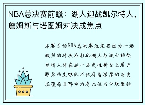 本赛季的NBA总决赛注定将成为一场激烈的对决,洛杉矶湖人与波士顿凯尔特人将在这一历史性舞台上展开厮杀。两支球队不仅有着深厚的历史底蕴,而且阵中均有几位当今联盟的顶级球员,尤其是詹姆斯与塔图姆之间的对决...